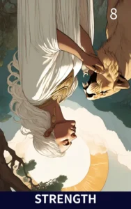 逆位置の力は、無力さや意志の薄れを暗示します。本能に振り回されるがままに、自らの感情や行動を制御することが難しくなり、諦めや落胆によって停滞が続く危険性を示しています。獅子が暴れる様子は、感情の波に飲み込まれる時期を表しており、目的への道が閉ざされたように感じられるかもしれません。